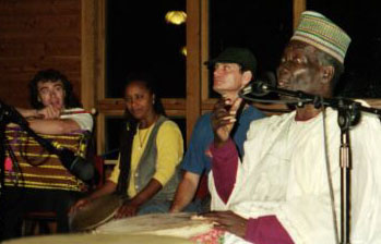 Randy Crafton, Ubaka Hill and Bob Bloom listen attentively as Babatunde Olatunji, considered by many to be the grandfather of the drumming movement in this country, shares his wisdom and skills at Friday night's opening ceremonies.