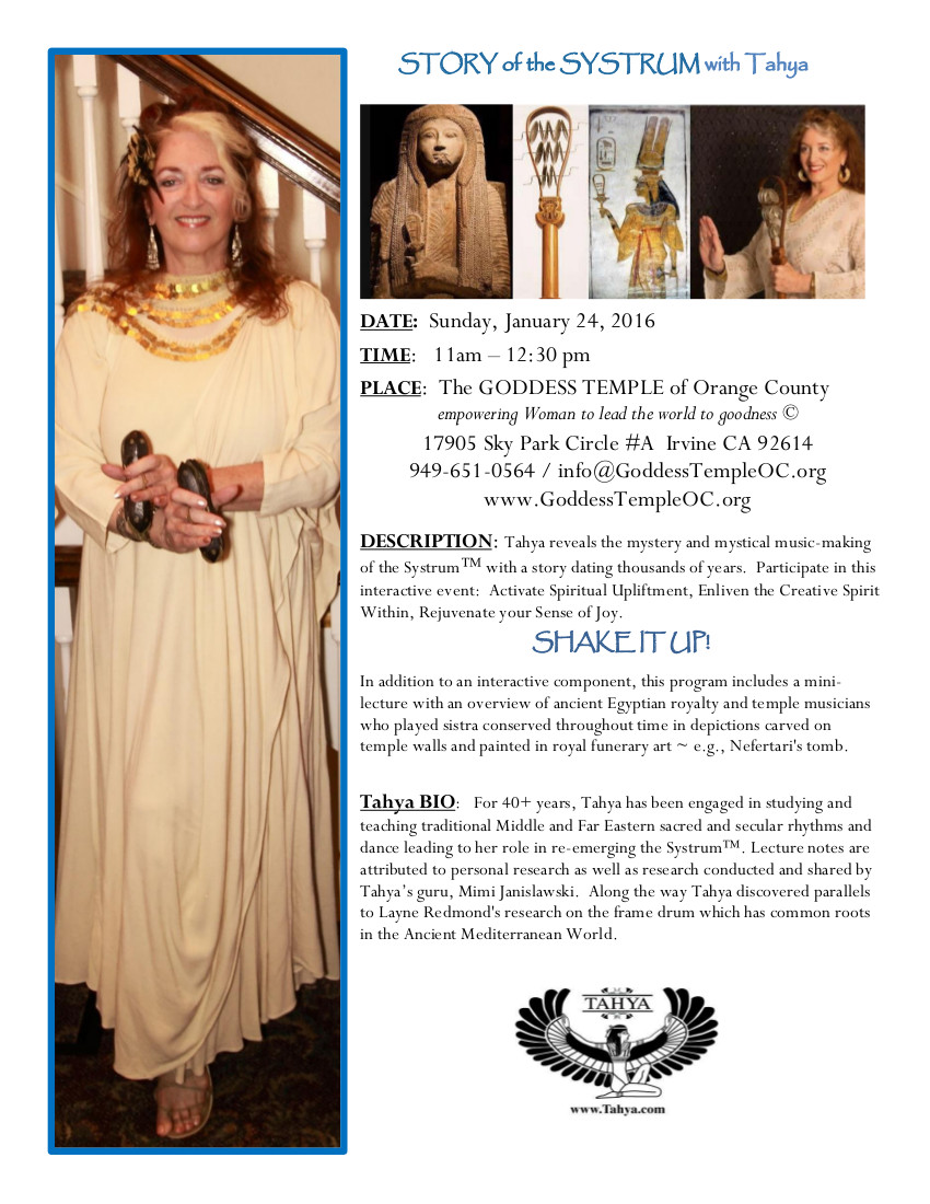 For 40+ years, Tahya has been engaged in studying & teaching traditional Middle and Far Eastern sacred and secular rhythms and dance leading to her role in re-emerging the Systrum™. Lecture notes are attributed to personal research as well as research conducted and shared by Tahya’s guru, Mimi Janislawski. Along the way Tahya discovered parallels to Layne Redmond's research on the frame drum which has common roots in the Ancient Mediterranean World.